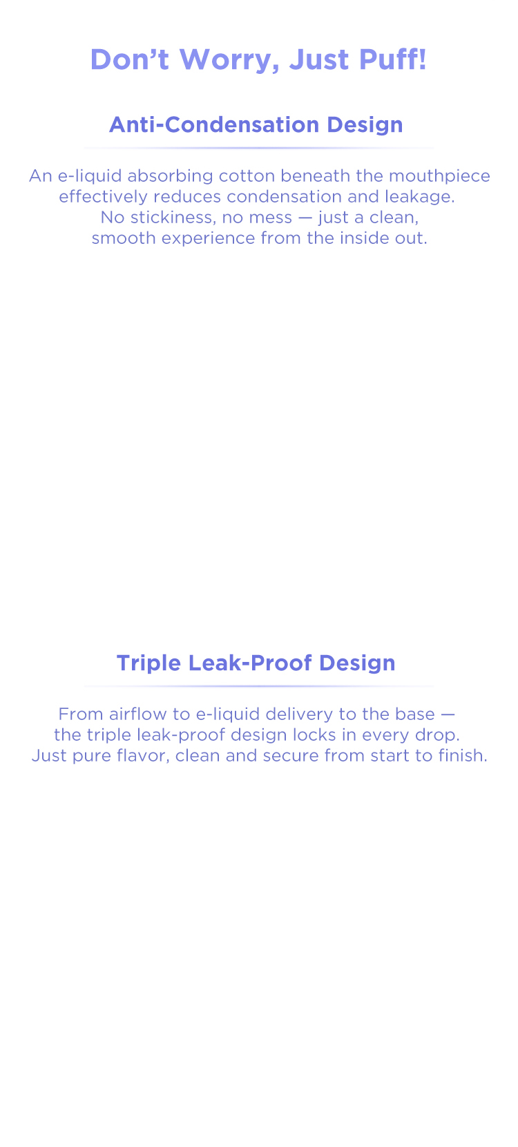 From airflow to e-liquid delivery to the base — the triple leak-proof design locks in every drop. Just pure flavor,